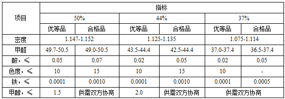 1.產品特點:是一種無色液體,易(yi)聚合,易(yi)溶(rong)于水(shui)、醇和醚(mi)。在空氣中能(neng)迅速被(bei)氧(yang)化為甲酸(suan),是強還原劑,沸(fei)點-19℃,凝固點-118℃,相對空氣密度1.067。商(shang)業產品(pin)是以液(ye)態形(xing)式供應(ying),稱(cheng)為(wei)福爾馬林(lin),是37~50%的甲醛溶液并(bing)加小量甲醇作(zuo)阻(zu)聚劑。溶液呈(cheng)乳白色,具惡(e)臭。福爾馬林容易氣化放(fang)出甲醛氣體,沸(fei)點96℃,相對密度0.815/-20℃,閃(shan)點55℃。